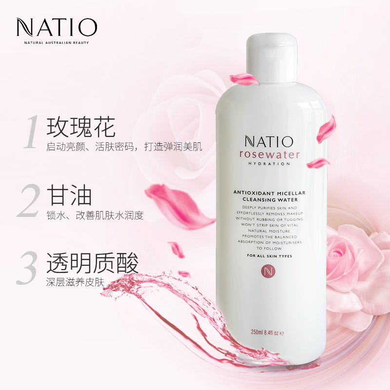 澳大利亚NATIO玫瑰水抗氧化卸妆水250ml天然水感 孕妇 敏感肌可用